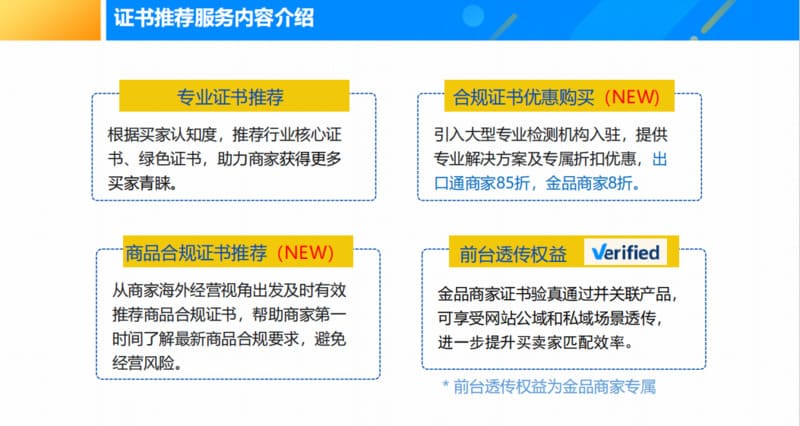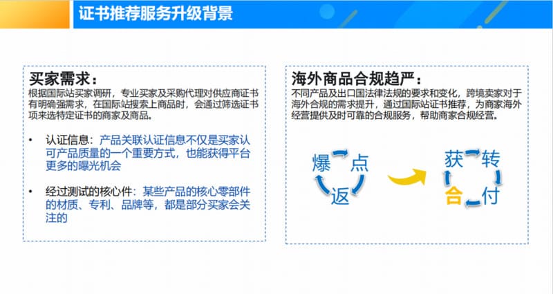 根据国际站买家调研,专业买家及采购代理对供应商证书有明确强需求,在国际站搜索上商品时,会通过筛选证书项来选特定证书的商家及商品。